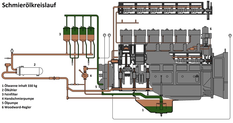 zur An-wendung. Es lohnt sich, wenn wir auch hier ge-nauer hinsehen. Um die beweglichen Teile des Dieselmotors und des Abgasturboladers ausreichend schmieren zu kön-nen, wurde eine Schmieranlage verbaut. Diese besass unterhalb des Motors eine Wanne, in der das Schmiermittel lagerte. Die