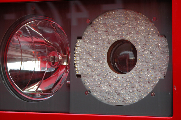 mit den identischen Lampen versehen worden. Doch nun zum Aufbau derselben. Die beiden übereinander liegenden Lampen teilten sich in jene für das Signalbild und jene für das Fernlicht auf. Beim Signallicht waren die Farben rot und weiss möglich und es kamen LED zur Anwendung. Dabei war die Helligkeit so gross, dass mit diesen Lampen auch