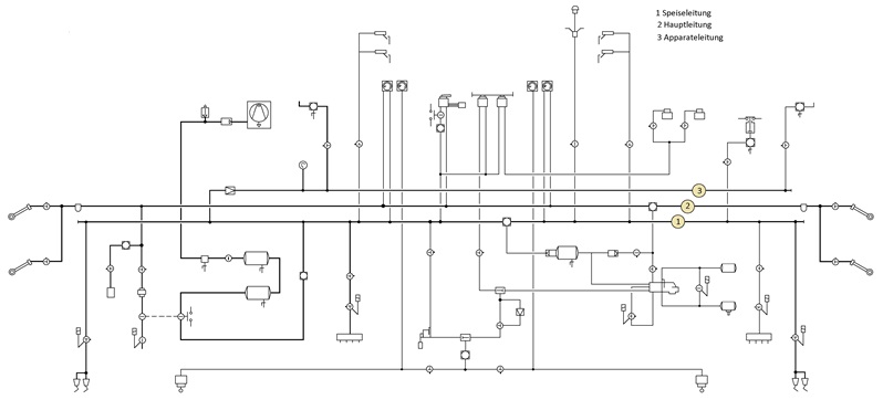 Druck in dieser Leitung an-zeigte. Damit kehren wir wieder zur Speiseleitung zurück. An dieser Leitung waren neben den Bremsên nicht viele Verbraucher angeschlossen worden. Dazu gehörte neben der